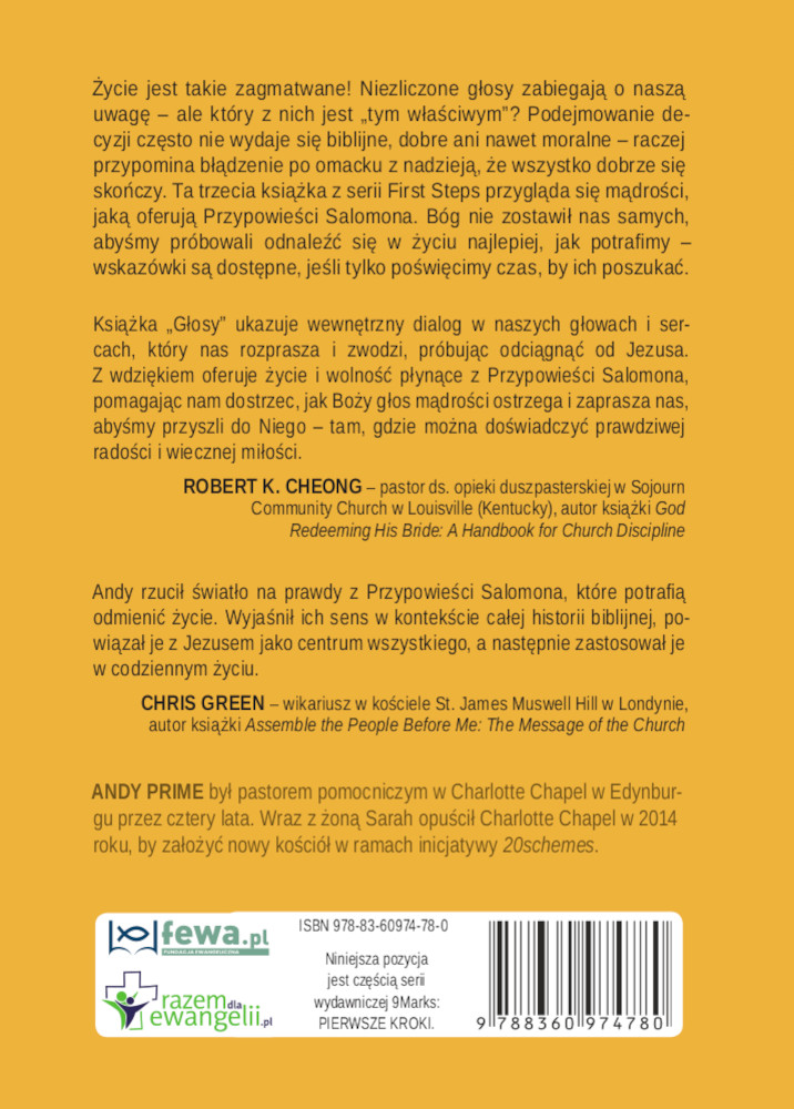„Głosy” ukazują wewnętrzny dialog w naszych głowach i sercach, który nas rozprasza i zwodzi, próbując odciągnąć od Jezusa. Książka „Głosy” w ujmujący sposób oferuje życie i wolność, czerpiąc z Przypowieści Salomona, pomagając nam dostrzec, jak mądry głos Boga ostrzega nas i zaprasza, byśmy przyszli do Niego – tam, gdzie można doświadczyć prawdziwej radości i wiecznej miłości. „Głosy” to świetne narzędzie w uczniostwie, które pomoże rozwinąć się wszystkim członkom kościoła.